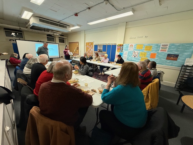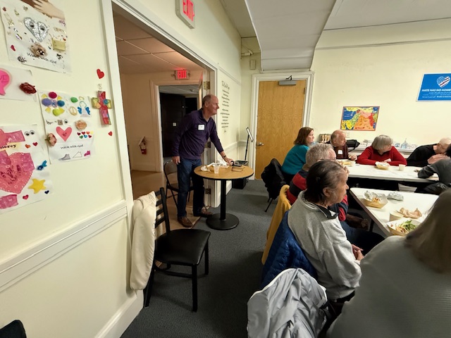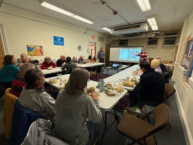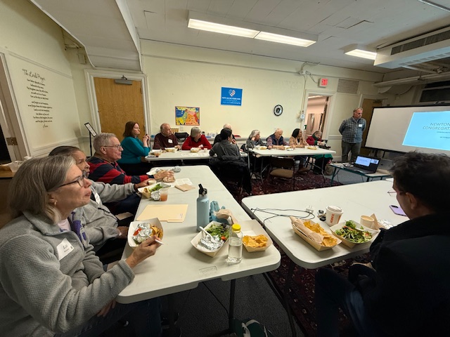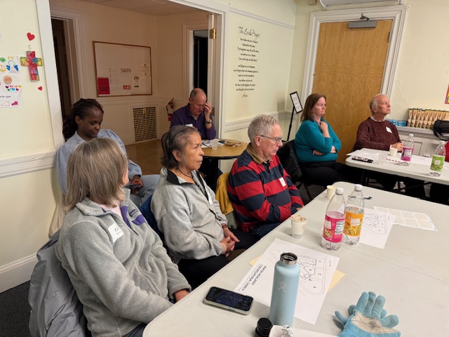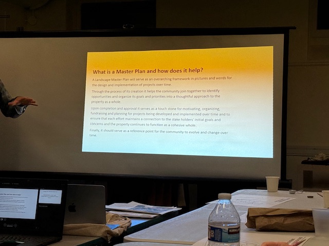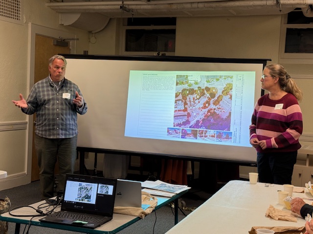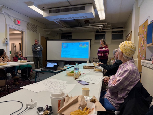 About 20 people (including one on Zoom) gathered in the downstairs meeting room of Newton Highlands Congregational Church, UCC, on Tuesday, October 28, 2025, to hear ideas for the church grounds that have been compiled by landscape architect Karen Sebastian and design builder and restoration contractor David Nauss.