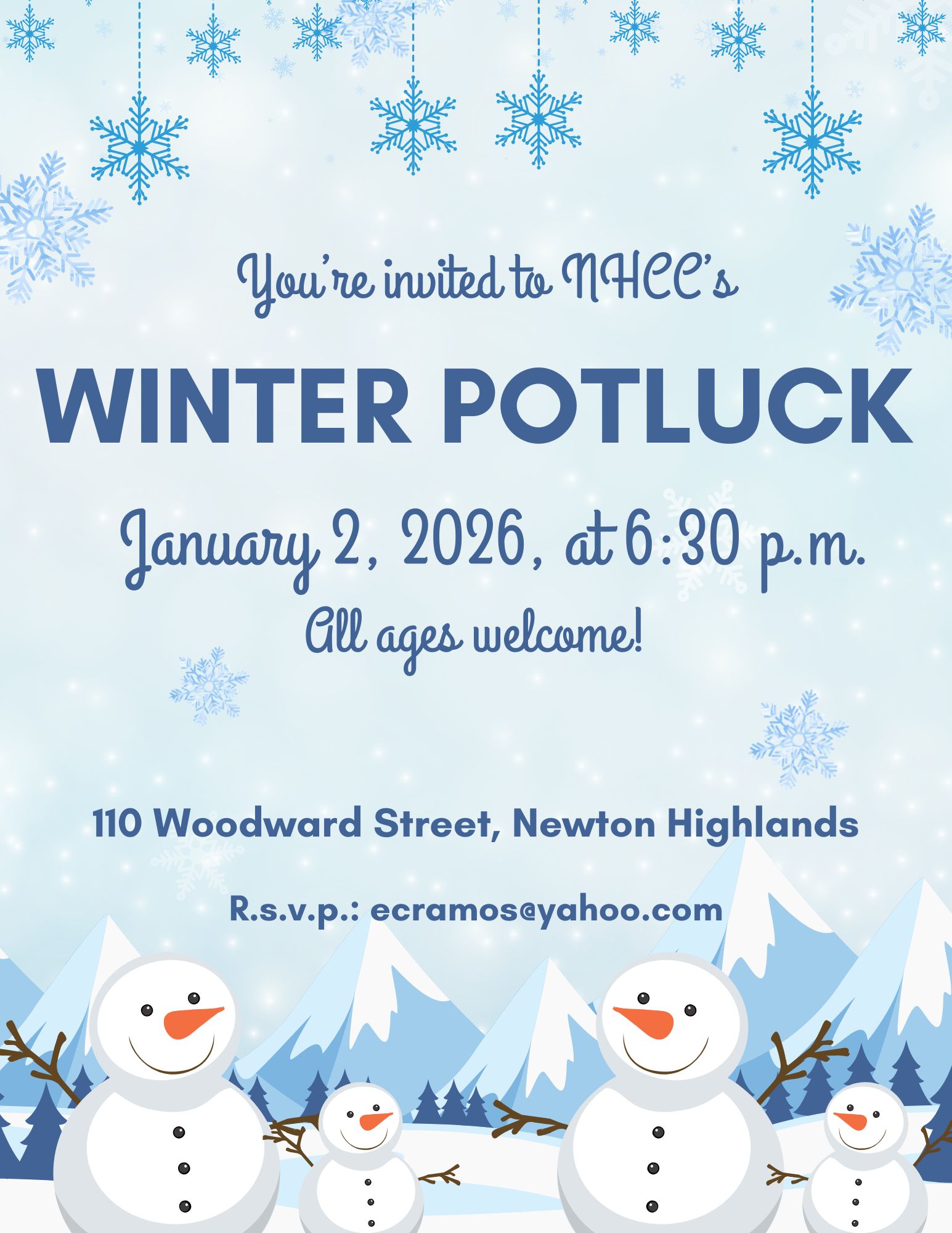 The Ramos family will continue NHCC’s tradition of marking the end of the holiday season with a potluck for church members and friends of all ages at 6:30 p.m. on Friday, January 2, 2026, in Newton Highlands.