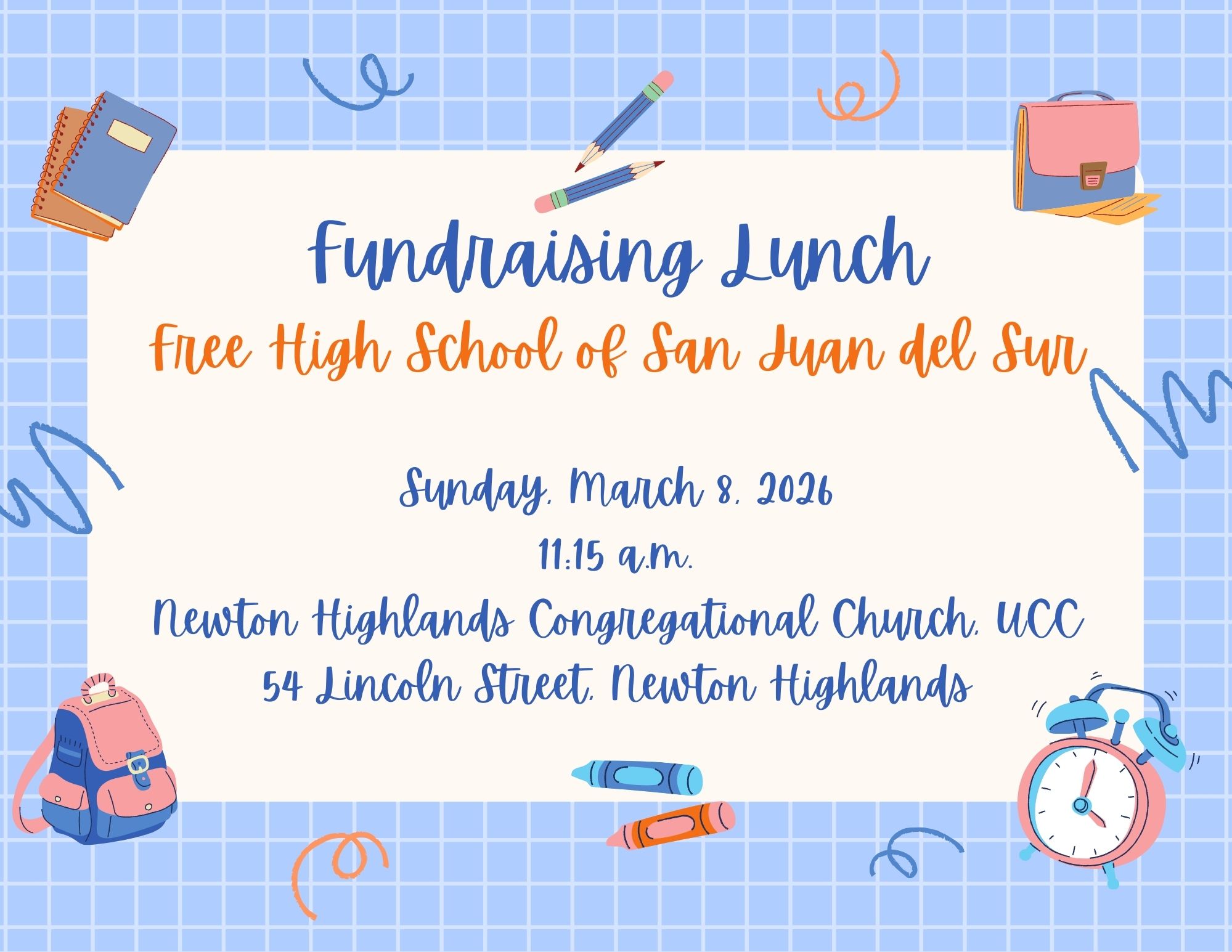 Join members of the Newton Highlands Congregational Church, UCC, Mission Committee for lunch on Sunday, March 8, 2026, at 11:15 a.m., and hear an engaging talk by NHCC member Jean Christoffersen and Louis Fiore about the Free High School and a free health clinic in San Juan del Sur, Nicaragua, Newton’s Sister City. The lunch is free and donations are welcome!