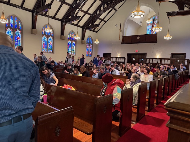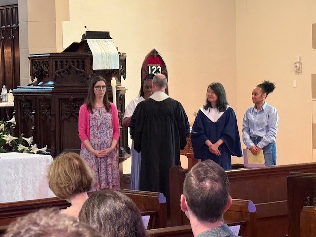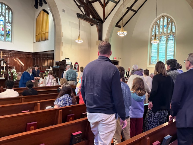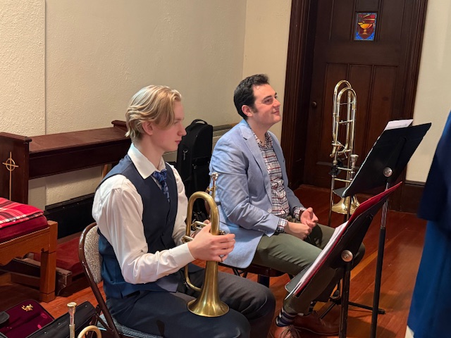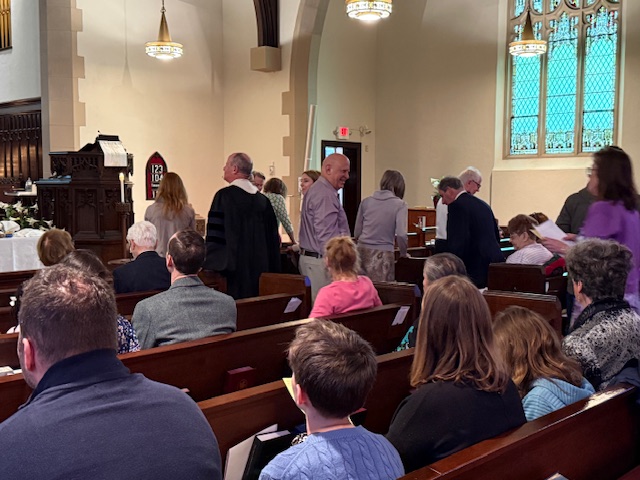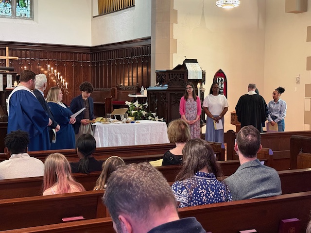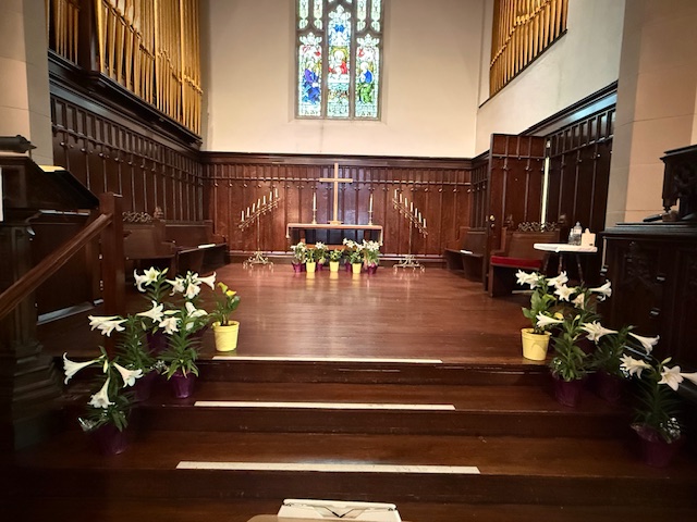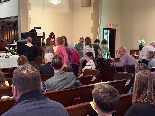 The intergenerational worship service featured the melodious church choir, guest musicians Luke Wozek (trumpet) and Samuel Hausman (trombone), and the celebration of communion. The chancel was decorated with lilies.