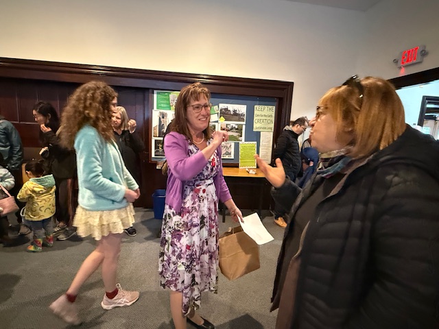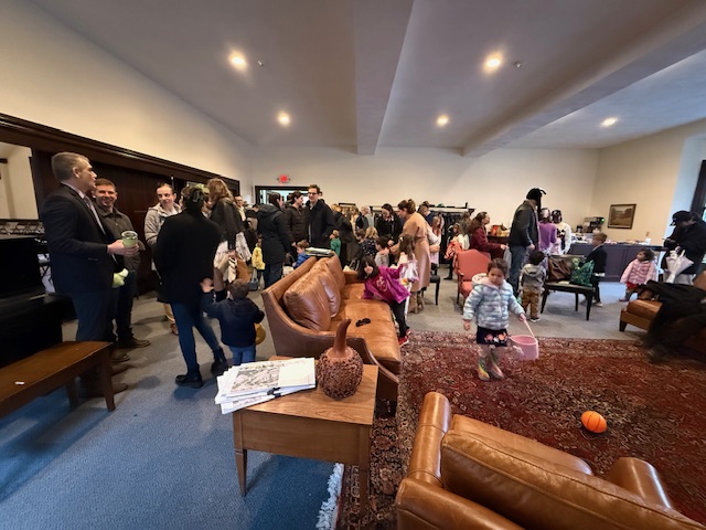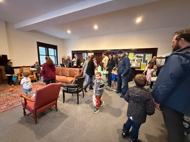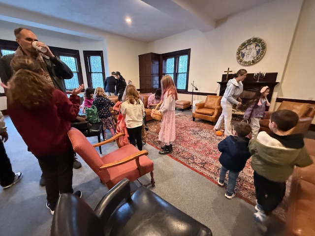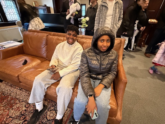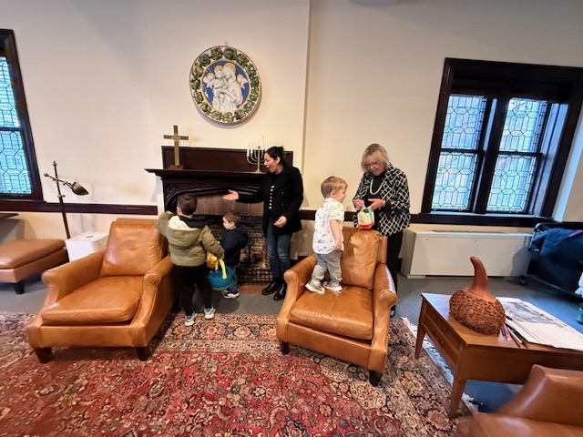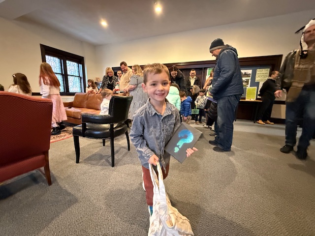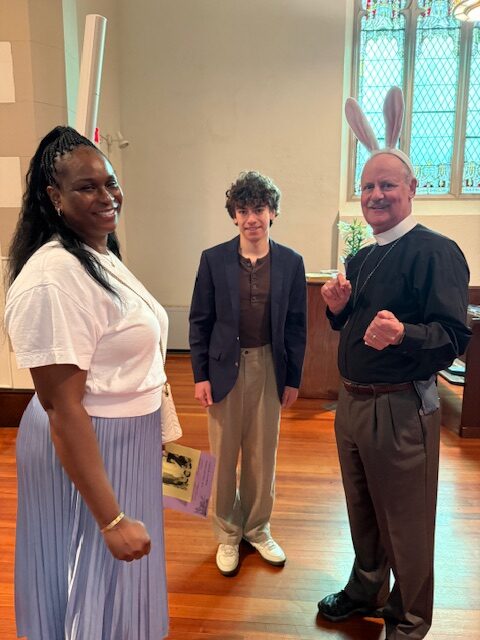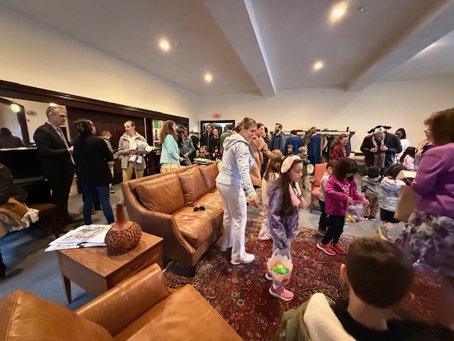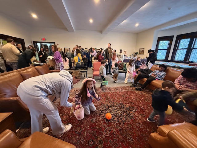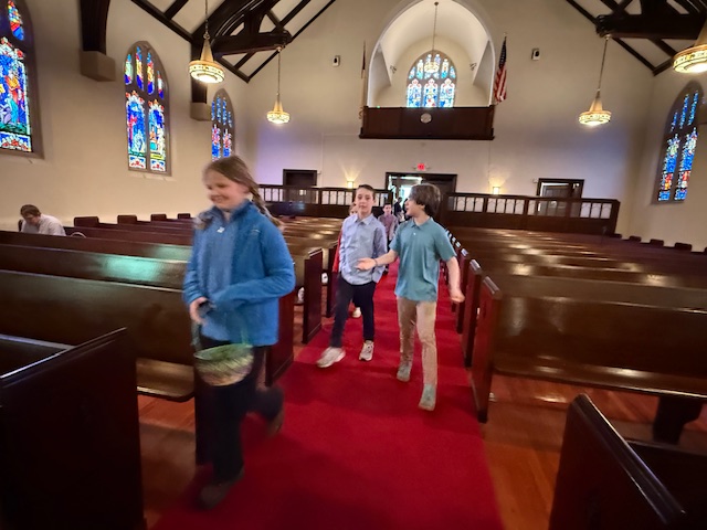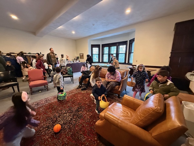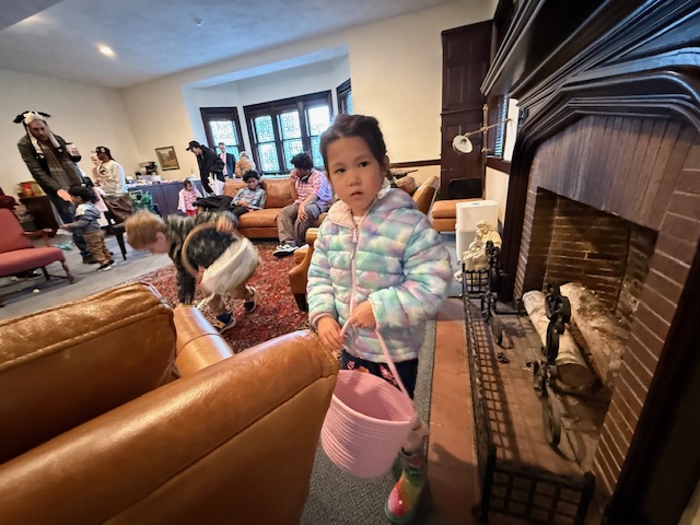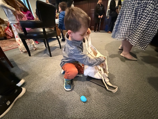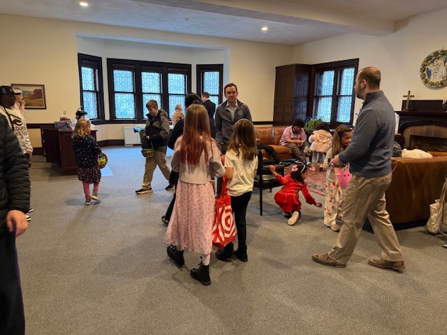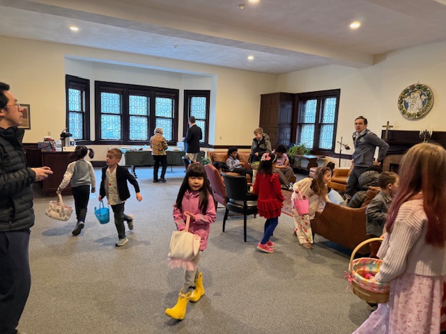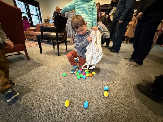 The action moved indoors with a busy neighborhood egg hunt in the church parlor and Great Hall. Director of Christian Education Wendy Donnell had stuffed about 700 eggs; they were hidden by church teens and rapidly located by a horde of excited children.