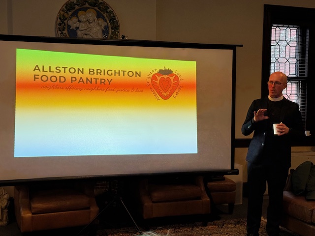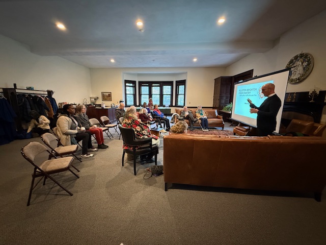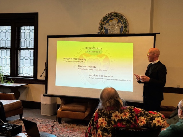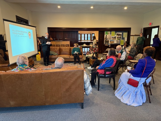 During fellowship time, the Reverend Dr. Rasure, currently director of development at Allston Brighton Food Pantry, spoke about food security in Greater Boston and Massachusetts.