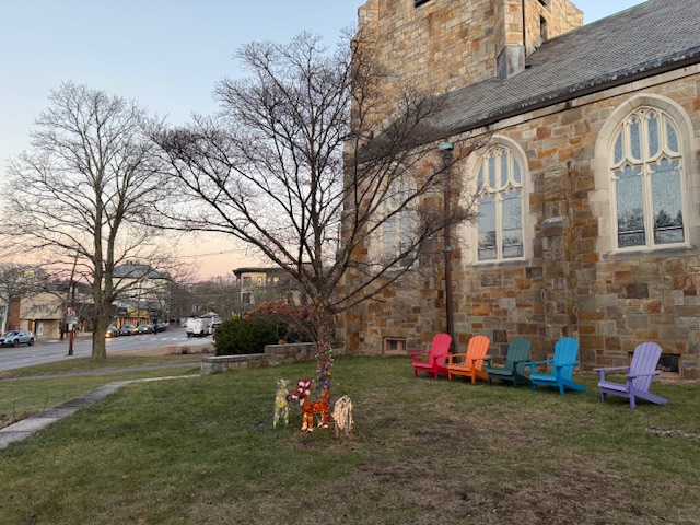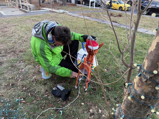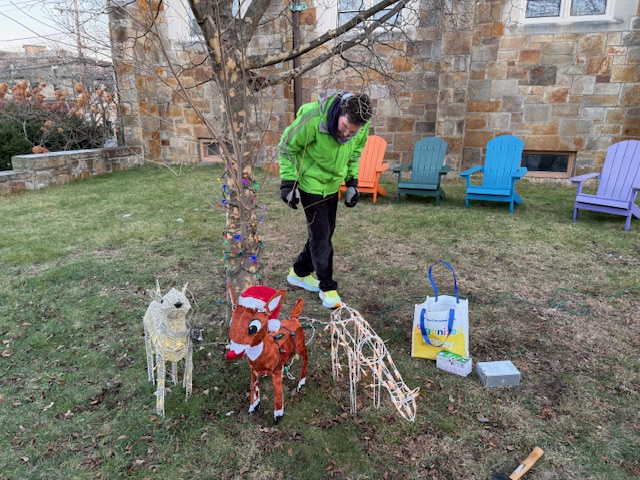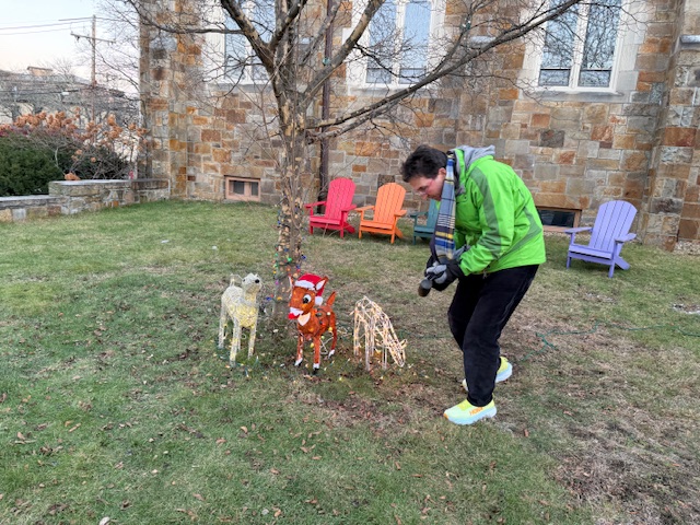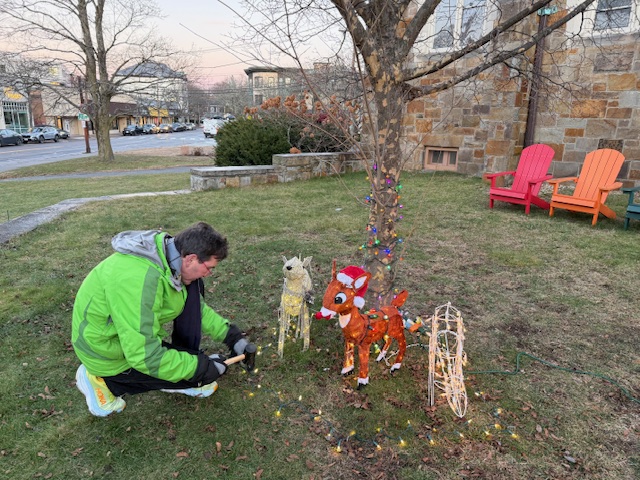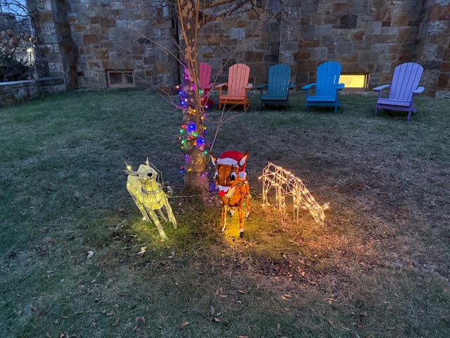 Jeff Kaplan, longtime friend of Newton Highlands Congregational Church, UCC, veterinarian, and fan of holiday lights, installed three diverse lighted reindeer on the church lawn on December 6, 2025.