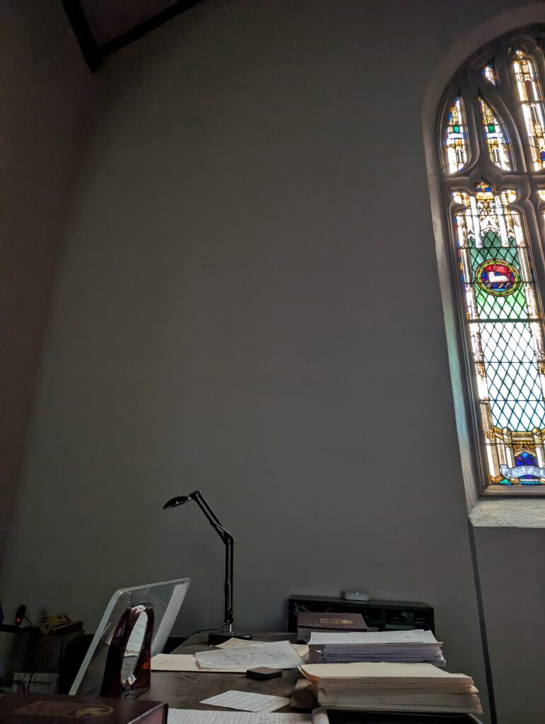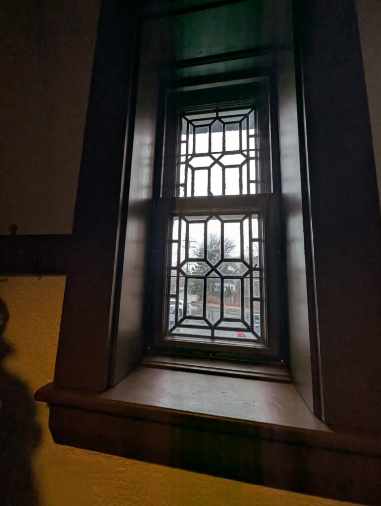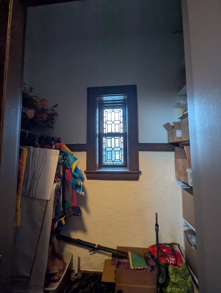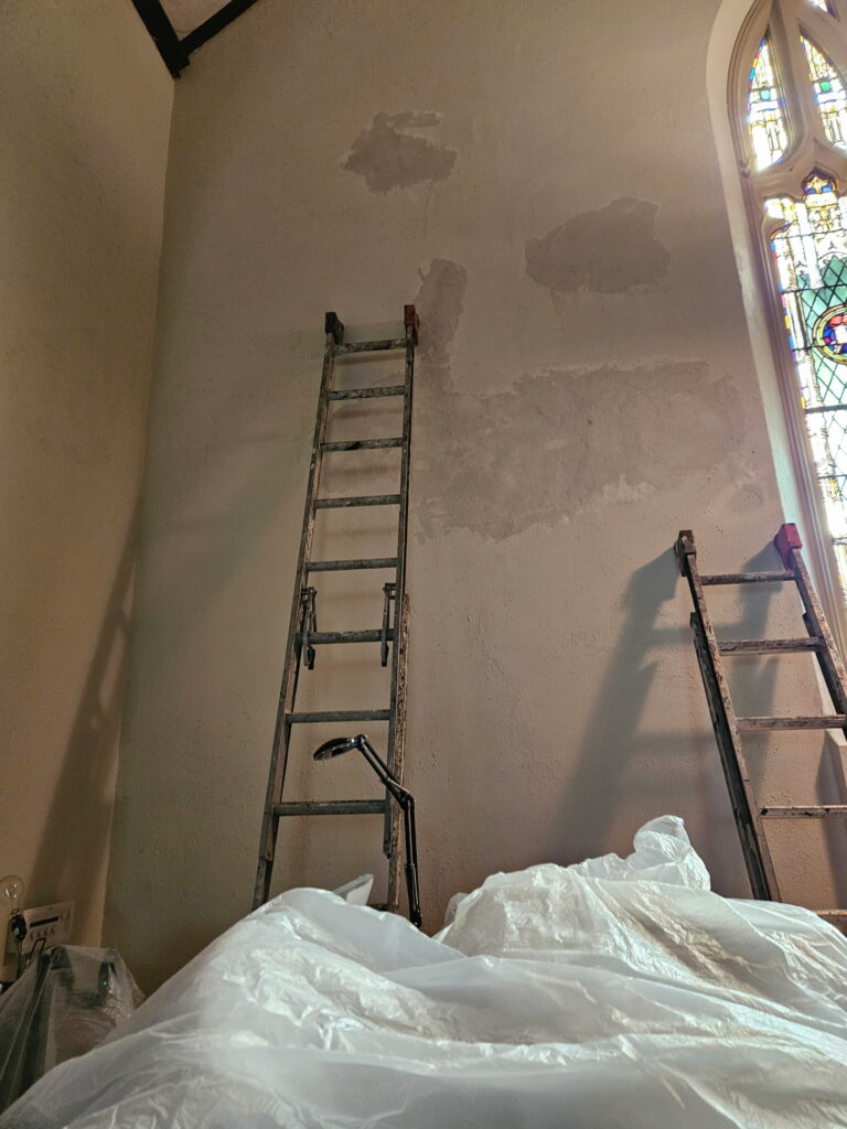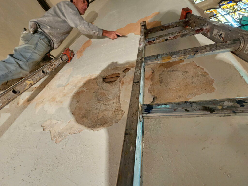 Painter Peter Glezellis and his partner fixed the wall by the organ and in the closet next to the choir loft. To prevent future water damage, the painters installed plexiglass for the small window in the closet instead of a storm window.
