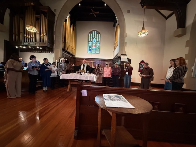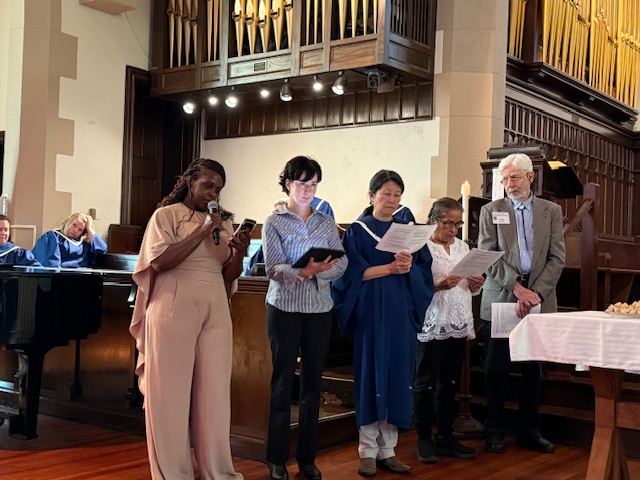 Congregants heard prayers in English and also in Danish, Japanese, Luganda, Ukrainian, Tagalog, Hebrew, and Swahili on World Communion Sunday — October 5, 2025, at Newton Highlands Congregational Church, UCC.